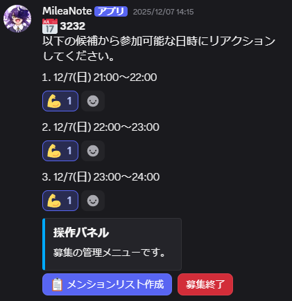 - 参加表明: 希望する日時にリアクションを各自行う。