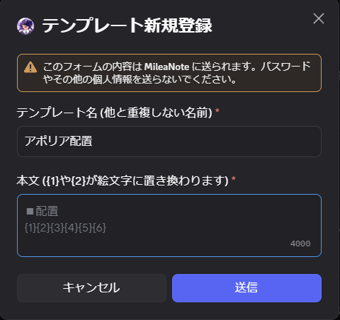 - テンプレート名: 呼び出すときに分かりやすい名前を付けます。(例: 「アポリア配置」)
