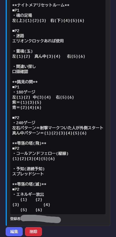 設定した開始日(および周期ごとの日時)になると、自動的に募集パネルが投稿されます。 固定メンバーとして登録された人は、最初から全日時「参加(〇)」状態で登録されているため、欠席の場合は各自はエントリ日時からチェックを外すだけでOKです。