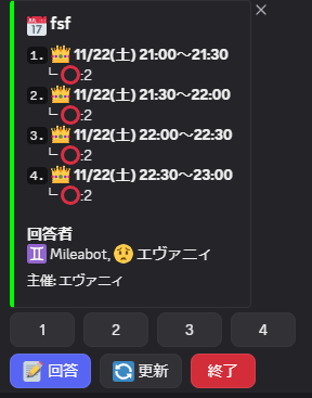 - 参加表明: パネルの「回答」ボタンから、参加可能な日時を選んで、担当ジョブ(絵文字)を選ぶだけ。